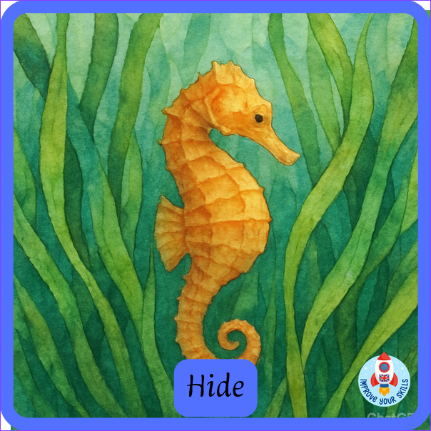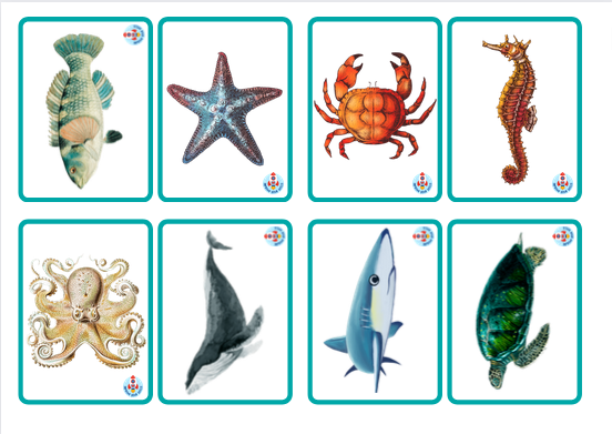 – Who Am I? – Guess the Sea Animal – Rozwijanie umiejętności zadawania pytań i udzielania odpowiedzi. Utrwalanie nazw zwierząt morskich. Budowanie prostych struktur komunikacyjnych: “Am I big?”, “Do I have eight legs?”, “Yes, you are.”