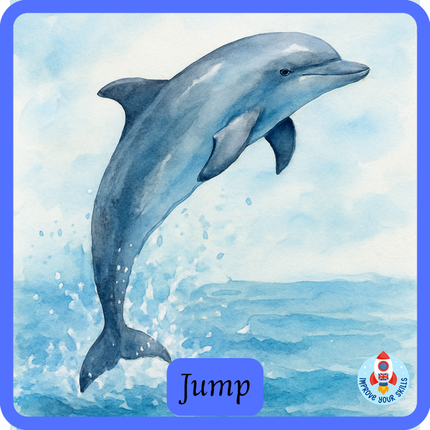 Action Verbs: jump – skakać, crawl – pełzać, walk – chodzić, chase – polować, stick – przyklejać się (do podłoża), pinch – szczypać, clap – klaskać, splash – pluskać (wodą), float – unosić się, hide – chować się, swim – pływać, hide – nurkować